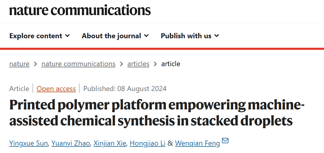 近日,冯文骞研究员团队开发了一种基于液滴的打印芯片,能够使其上的不同液相自组织成堆叠层以在其中进行化学转化。具体而言,通过无掩模光固化和对该带孔聚合物薄膜的后化学修饰,赋予该芯片精密的聚合物打印能力,使其能够定制10μm以下特征图案,用于限制印刷图案内的不同液体的精准落位。这种芯片表面模板化液层的堆叠方式具有开放式特性,将机器辅助液滴操作、同步瞬时反应触发、局部振荡和对各个层的实时监测变为现实。随着机器操作线和自主学习的进一步集成,这种基于液滴的平台有可能成为开发化学工具包的宝贵补充,实现合成过程的自主运行。相关工作以“Printed polymer platform empowering machine-assisted chemical synthesis in stacked droplets”为题发表在《Nature Communications》期刊上,论文的第一作者为金沙js5588硕士研究生孙营雪,通讯作者为金沙js5588冯文骞研究员。