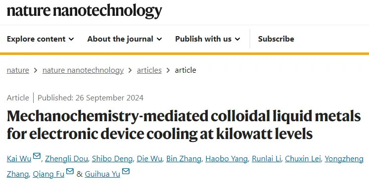 近日,学院傅强教授/吴凯副研究员团队联合美国德克萨斯大学奥斯汀分校,开发出了一种新型热界面材料一一胶体状液态金属,以应对这一挑战。他们通过机械化学的方法制备了一种液态金属/氮化铝胶体,该材料表现出卓越的导热性能和触变性,显著降低了固-固界面的热阻,缩小了现有TIMs与理论之间的差距。经测试,这种胶体的热阻仅为0.42-0.86mm2K/W,远超当前领先的导热材料的性能。在结合微通道冷却系统的测试中,这种胶体能够从16平方厘米的热源中提取2760瓦的热量,同等条件下相比最先进的硅脂可以减少65%的泵电力消耗,为千瓦级设备的可持续冷却提供了新方案。这一研究成果以“Mechanochemistry-mediated colloidal liquid metals for electronic device cooling at kilowatt levels"为题,发表在《Nature Nanotechnology》期刊上。学院吴凯副研究员(德克萨斯大学奥斯汀分校访学者),博士生窦正力、邓世博为共同第一作者,吴凯副研究员、傅强教授和德克萨斯大学奥斯汀分校余桂华教授为共同通讯作者。