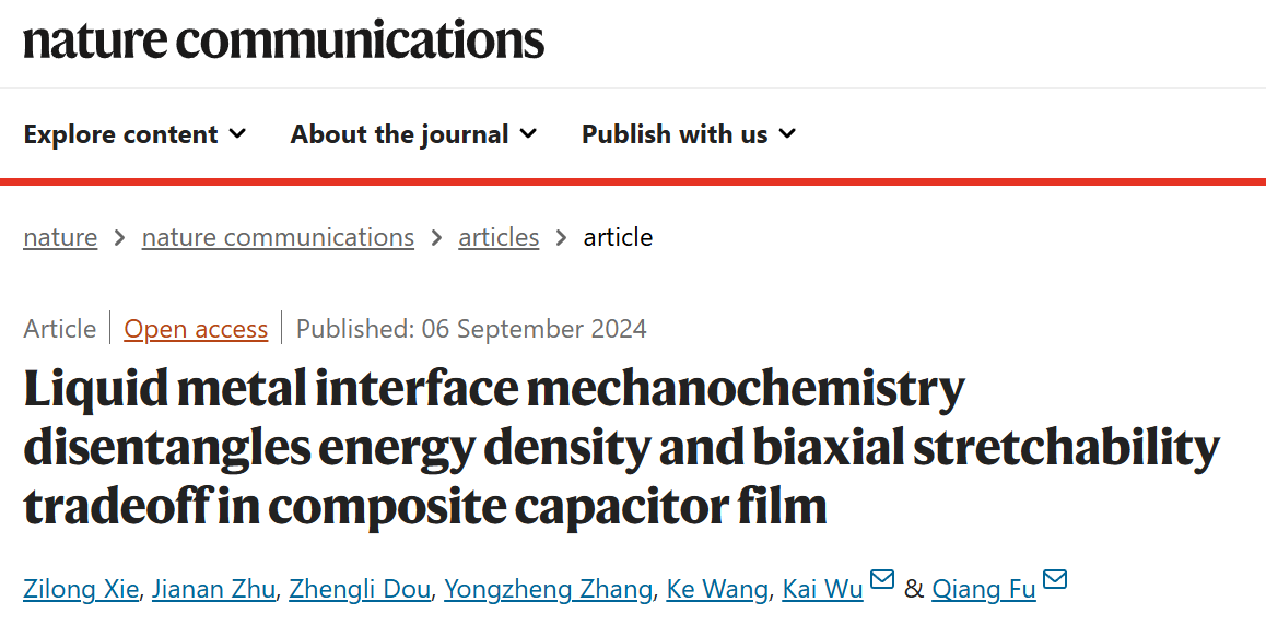 相关成果以“Liquid metal interface mechanochemistry disentangles energy density and biaxial stretchability tradeoff in composite capacitor film"为题发表在《Nature Communications》期刊上。文章第一作者是金沙js5588博士生谢紫龙,金沙js5588吴凯副研究员(德州大学奥斯汀分校访问教授)、傅强教授为本文的通讯作者。该研究得到了国家自然科学基金(52103091、52373042)、国家重点研发计划(2022YFB3806900)、四川省自然科学基金(2024NSFSC1025)、金沙js5588优秀青年教师名师名校访学计划和南方电网联合实验室项目(1500002022030103GY00035)的支持。
