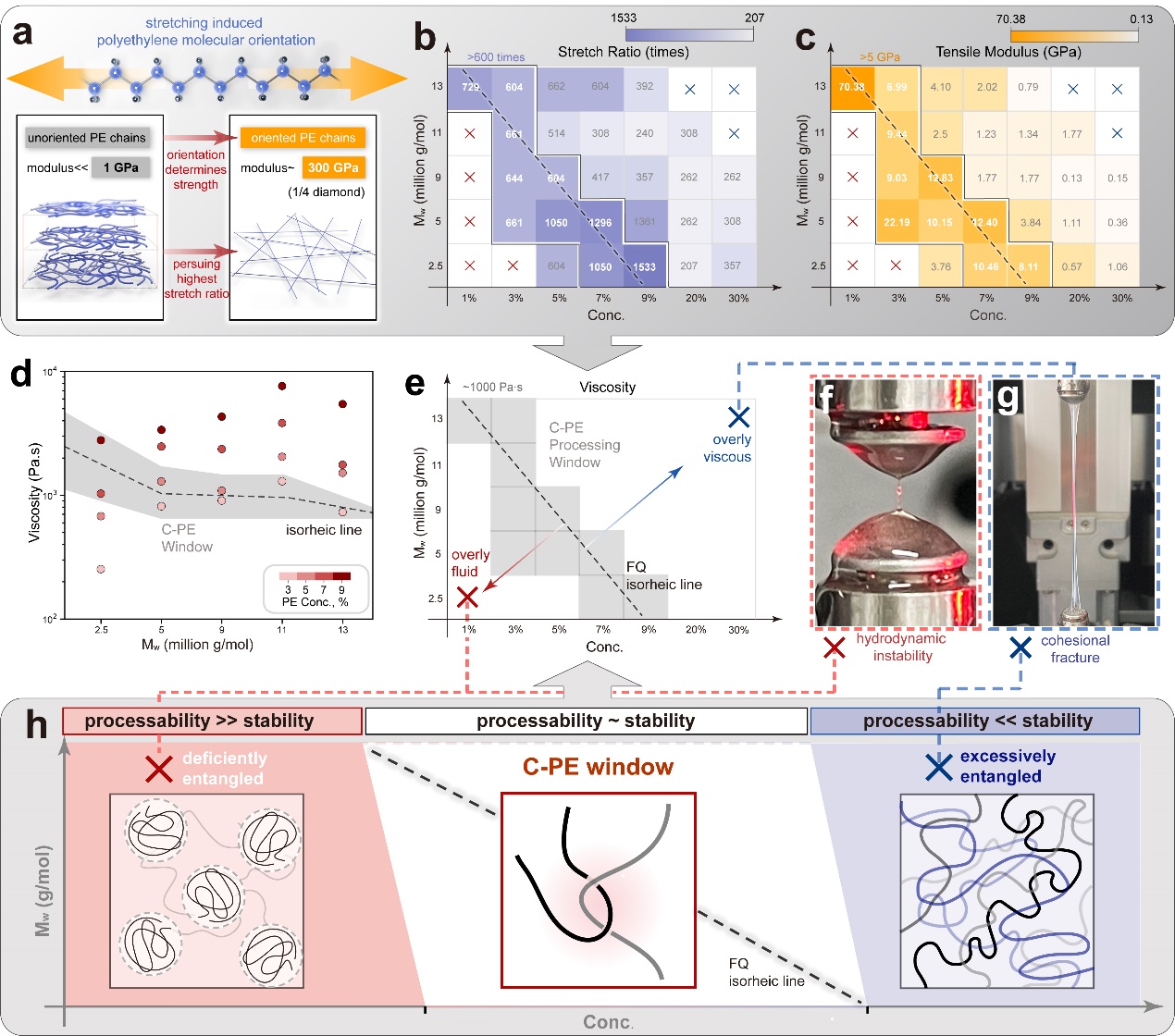 热力学起点:加工窗口理论:聚乙烯加工的一个永恒主题就是拉伸取向。通过拉伸,聚乙烯理论上可以实现高达300 GPa的杨氏模量(图3a)