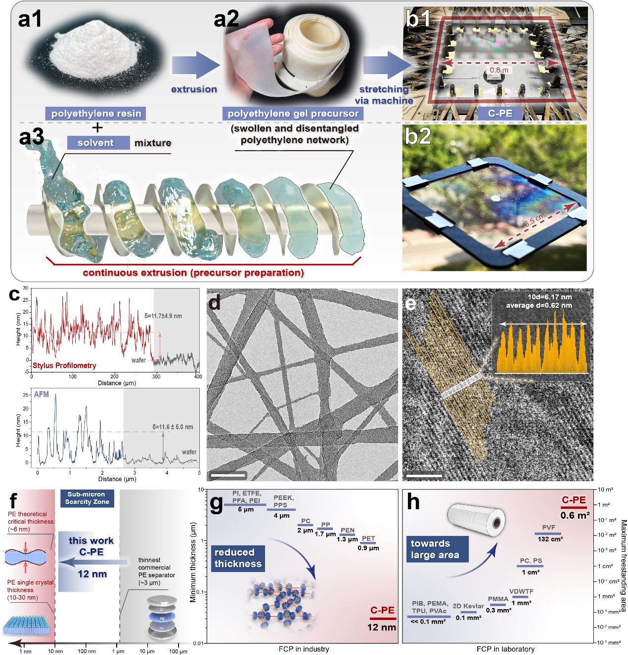 图2. 聚乙烯极薄膜加工工艺;极薄膜外观、厚度与微观结构表征;极薄膜与市面和其他实验室已报道薄膜材料在厚度和面积上的对比