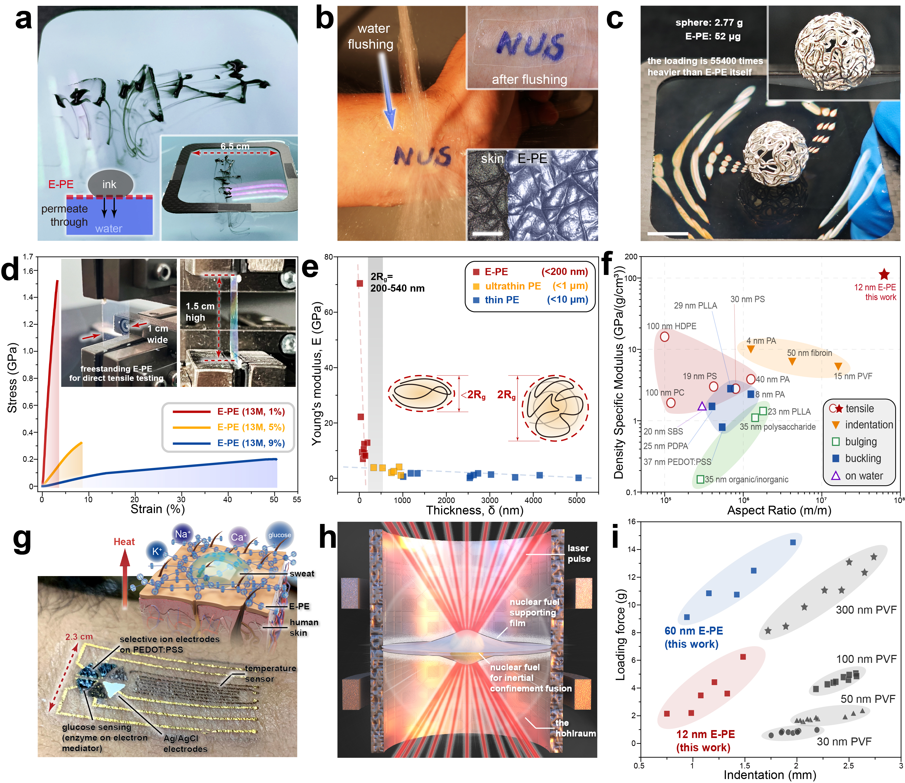 新物理性质与应用:当被薄化到极限时,聚乙烯展现出一系列独特的性质,与传统聚乙烯薄膜有显著不同。首先,其界面行为十分特殊。如图5a所示,尽管聚乙烯极薄膜表现出疏水性和非极性,但书写在其上的墨水能够穿透薄膜流入下方的水浴中。这一现象超越了传统聚乙烯的局限性,为膜分离等新应用提供了可能性。另一个显著特点是其卓越的机械强度,例如承载超过自身重量55,000倍的重量,性能远超目前报道的其他材料,甚至媲美高性能气凝胶。在实际应用中,这一特性至关重要,因为高分子超薄膜不仅需要具备自支撑能力,还要能够承受足够的外力。聚乙烯极薄膜的高机械强度,使其能够在完全自支撑状态下进行直接拉伸测试(图5d插图所示)。相比之下,传统超薄膜由于样品尺寸和强度的限制,一般只能通过压痕法等进行非自支撑状态测试。测试得出的拉伸强度(1.7 GPa),甚至远高于不锈钢(0.6 GPa)。相比于薄膜(<10 µm)和超薄膜(<1 µm)厚度减小时拉伸模量的微小提升,极薄膜的模量表现出完全不同的趋势(图5e)。一部分原因可是能由于其厚度低于聚合物的回转半径(Rg),薄膜变薄时刚性显著增强,这类似于极薄塑料中关键的橡胶硬化效应。这种现象归因于在回转尺度内的体积排斥效应,有助于减少链缠结并增强链取向。此外,聚乙烯极薄膜是目前超薄膜中难得的多孔膜,并且展示超高的比拉伸模量(113.9 GPa/(g/cm³),不锈钢为25.2 GPa/(g/cm³))以及接近10^8的极高长径比,这些性质在超薄膜中是十分罕见却重要的。