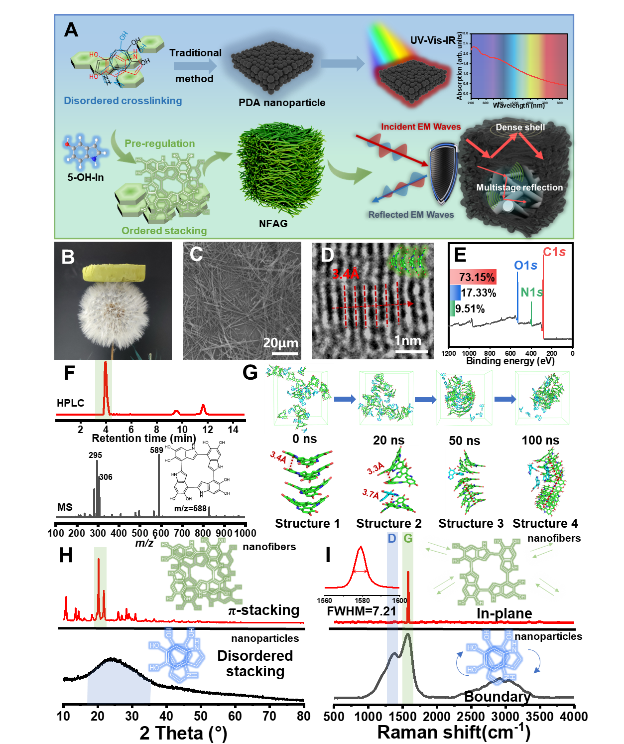 黑色素是一种典型的生物大分子色素材料,其在广泛的电磁波频谱(电离辐射,紫外,可见光,红外等)均具有普遍的能量耗散行为,然而其混乱无序的结构难以提供长程的电子转移路径,从而限制了材料对长波能量的响应。近期,学院李乙文教授团队通过超分子工程调控了黑色素材料组装过程中的交联及组装行为,重构了黑色素材料的有序网络,首次制备得到了高度有序的黑色素材料。具体来说,研究团队通过在聚合过程中提高环化吲哚的比例,并减少因氢键交联导致的无序结构,来诱导形成更多的组装结构而非交联结构。通过对材料的结构分析发现,5,6-二羟基吲哚环状四聚体在高取向的π-π堆积作用下形成了纳米纤维(图2)。相较于传统的黑色素材料,TEM,XRD和Raman光谱证实了有序黑色素纳米纤维对的高度有序性(图2)。进一步地研究了黑色素材料的微波吸收(最大反射损耗 - 68.87 dB,有效吸收带宽 5.25 GHz)和电磁屏蔽性能(X 波段中,密度 3.11 mg/cm³,厚度 2 mm 时,比屏蔽效能达 47909.9 dB・cm⟡/g)(图3),因为其轻质高效的特点(完全不含金属成分),材料达到了目前所报道的碳材料中的最高电磁屏蔽比效能。通过超分子工程所调控得到的黑色素材料展现了极佳的阻抗匹配,相较于传统的电磁屏蔽材料,其展现了以吸收型为主的损耗机理,这大大拓宽了其应用场景。这项工作构建了高度有序的人造黑色素纳米纤维材料实现了对微波能量的高效吸收,展现了极其优秀的性能和应用潜力,为更多具有复杂结构且难工程化的生物大分子材料的有序化调控提供了新的思路。
