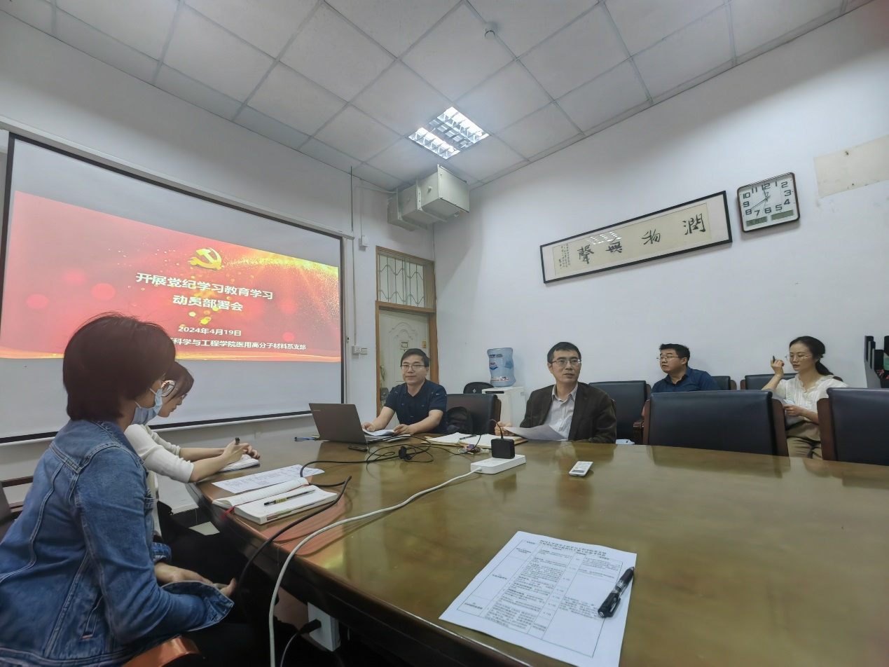 为深入领会习近平总书记关于党纪学习教育的重要讲话和重要指示批示精神,贯彻落实中央党的建设工作领导小组会议和《中共中央办公厅关于在全党开展党纪学习教育的通知》精神、学院医用高分子材料系党支部于2024年4月19日上午在学院主楼205会议室召开党纪学习教育动员部署会,并开展了主题为“严守党规党纪,强化自我约束”的党纪学习研讨活动。会议由医用高分子材料系支部书记赵伟锋主持,支部全体党员参加,公司党委委员、经理杨伟出席活动。