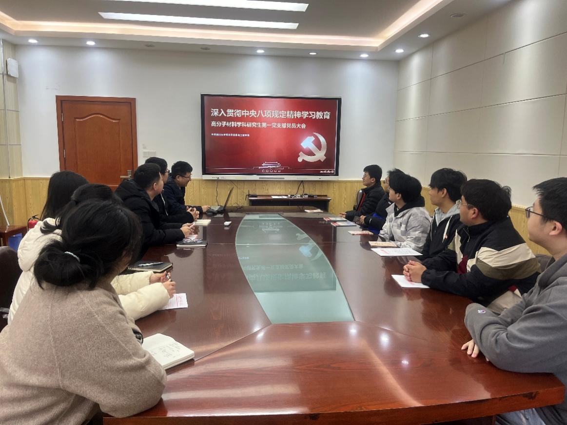 为持续推进全面从严治党工作,进一步增强党员纪律意识,筑牢思想防线。学院高分子材料学科研究生第一党支部于2025年3月28日在高分子研究所218会议室召开“深入贯彻中央八项规定精神”专题学习教育党员大会。