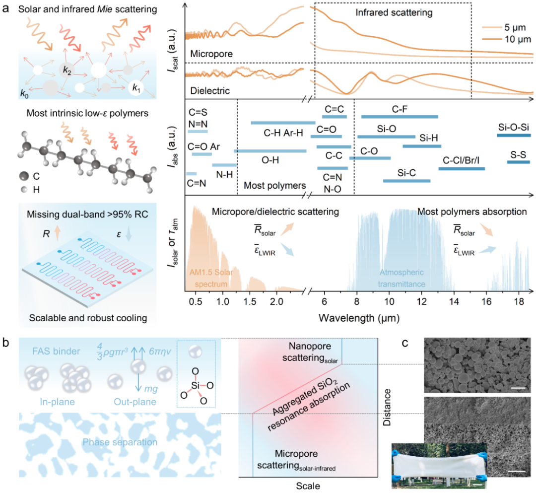 辐射制冷(RC)通过持续反射太阳光、发射红外光的方式实现目标介质的降温,被认为是缓解全球变暖和集成电子发热的有效途径。然而,两波段内光学性质的相互干涉限制了反射率和发射率的同步提升(> 95%),且已报道的微纳光子体系在成本、可扩展性和环境稳定性方面存在严重不足。近日,学院邓华教授团队利用“重力诱导粒子聚集”策略,构筑了一种具有可控电介质分布状态的稳定RC超材料。通过调控聚合物骨架中介电二氧化硅(SiO2, ...