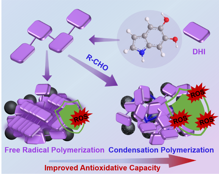 黑色素是一类重要的生物大分子,广泛存在于人与动物的皮肤和毛发中,在诸多生理活动中都起到核心调节作用。比如,黑色素可以通过清除过量的活性氧 (ROS) 维持人和动物体内的氧平衡,应用于对抗各种氧化应激诱发的疾病。这主要是由材料表面存在的大量邻苯二酚基团来实现,而这一能力深受材料内部致密层状结构的影响。天然和传统合成黑色素材料都是通过5,6-二羟基吲哚(DHI)单体的自由基聚合反应制备的,这一过程容易发生超分子...