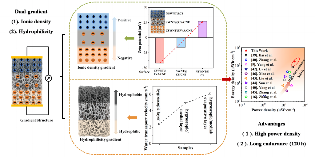 如今,为缓解化石燃料造成的能源危机和环境污染,绿色可再生能源(如太阳能、水电和风能)的研究发展迅速。然而,受气候、地理和设备尺寸的限制,上述能量路由器在设备小型化和实际应用方面仍然存在显著的局限性。如果自然界和生活过程中无处不在的潮湿空气能够诱导发电,这将大大扩大可持续的电力来源。湿气发电机(MEGs)利用水分子和活性材料之间的相互作用产生流动潜力,展示了绿色、可再生和便携的优势。但受限于输出功率...